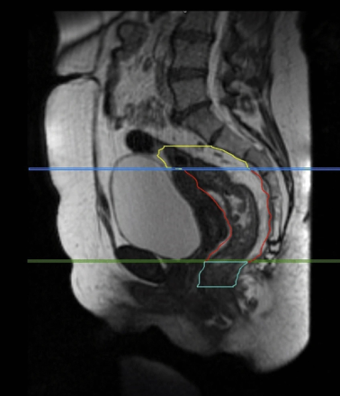 For the delineation of the mesorectum, the best approach is to follow the guidelines from the rectal cancer contouring atlas [4] which states that the mesorectum (space) extends from the rectosigmoid to the pelvic floor. In general, the full length of the rectum should be included, and every effort should be made to spare the anal canal.