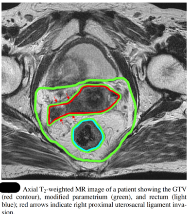 In summary, routine inclusion of the mesorectum in cervical cancer radiation therapy is not universally recommended; it is reserved for cases with posterior disease extension. Parametria involvement should be assessed and included with boosting the area to allow for adequate coverage and local control. Consensus guidelines reinforce the need for individualized planning, especially in complex or advanced cases, and underscore the importance of multimodality imaging to inform CTV delineation.
